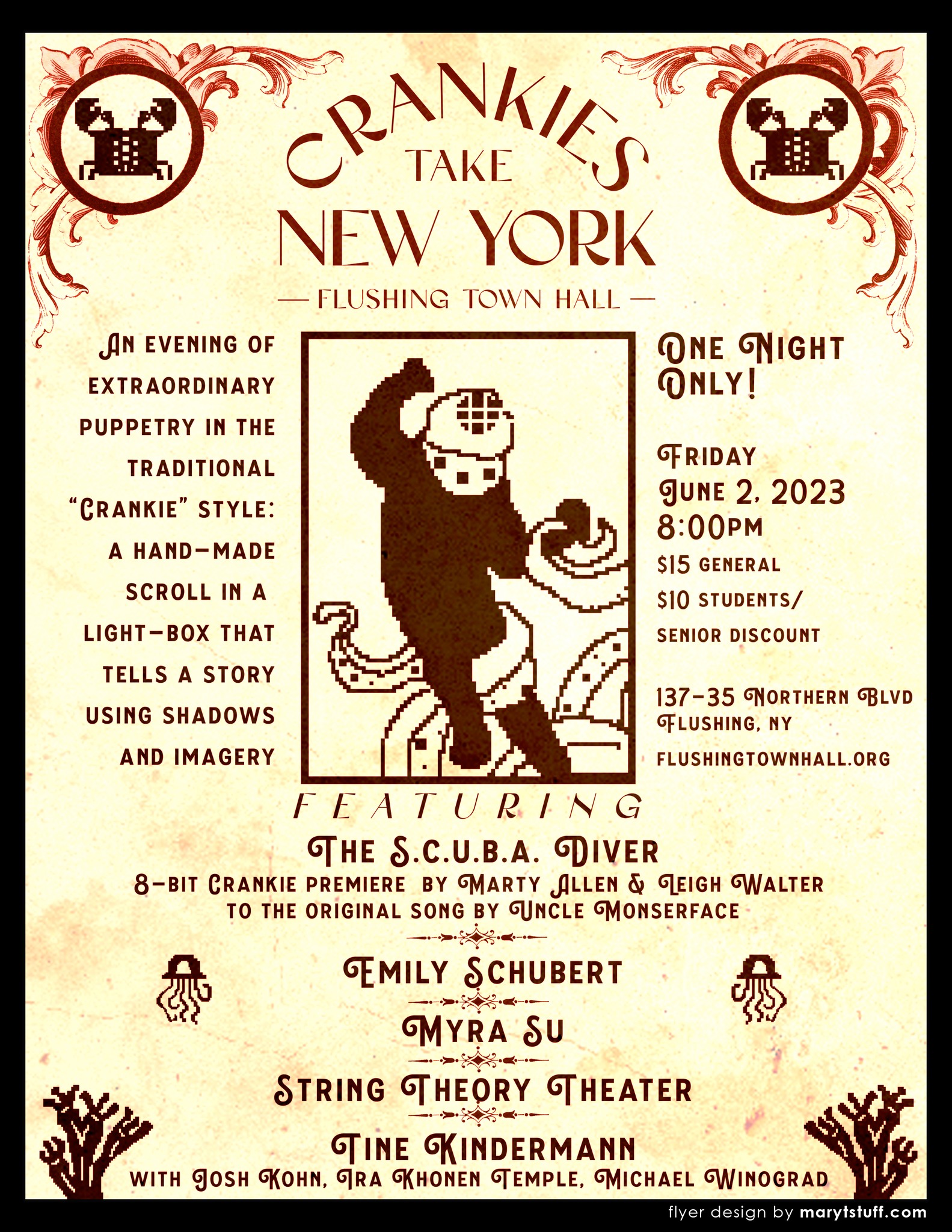 Watch the world’s greatest stories unroll before your eyes! Flushing Town Hall is pleased to announce this new (and soon to be beloved) festival of scrolled panoramas, known as “crankies.”