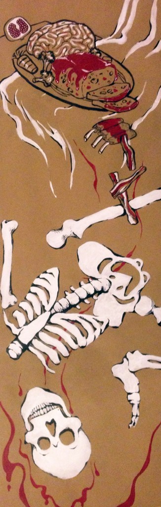 I storyboarded and constructed the frame (with a lot of help from Ray Vlcek – thanks Ray!) for the scroll puppet prologue for ‘Iron Bridal Feast.’ The artwork is by Isabel Gold and Lauren Wright. The scroll is an illustrated summary of the House of Tantalus. The chorus used the scroll in conjunction with their dumb-show performance.