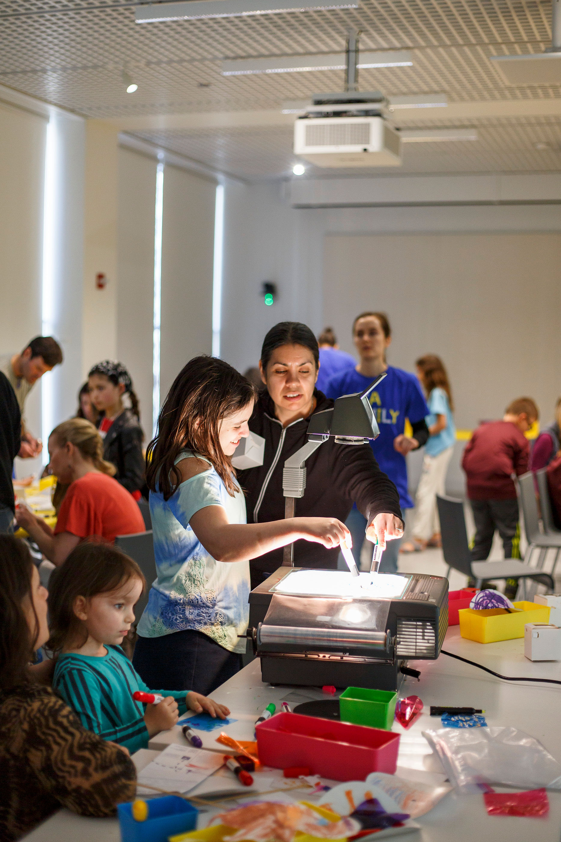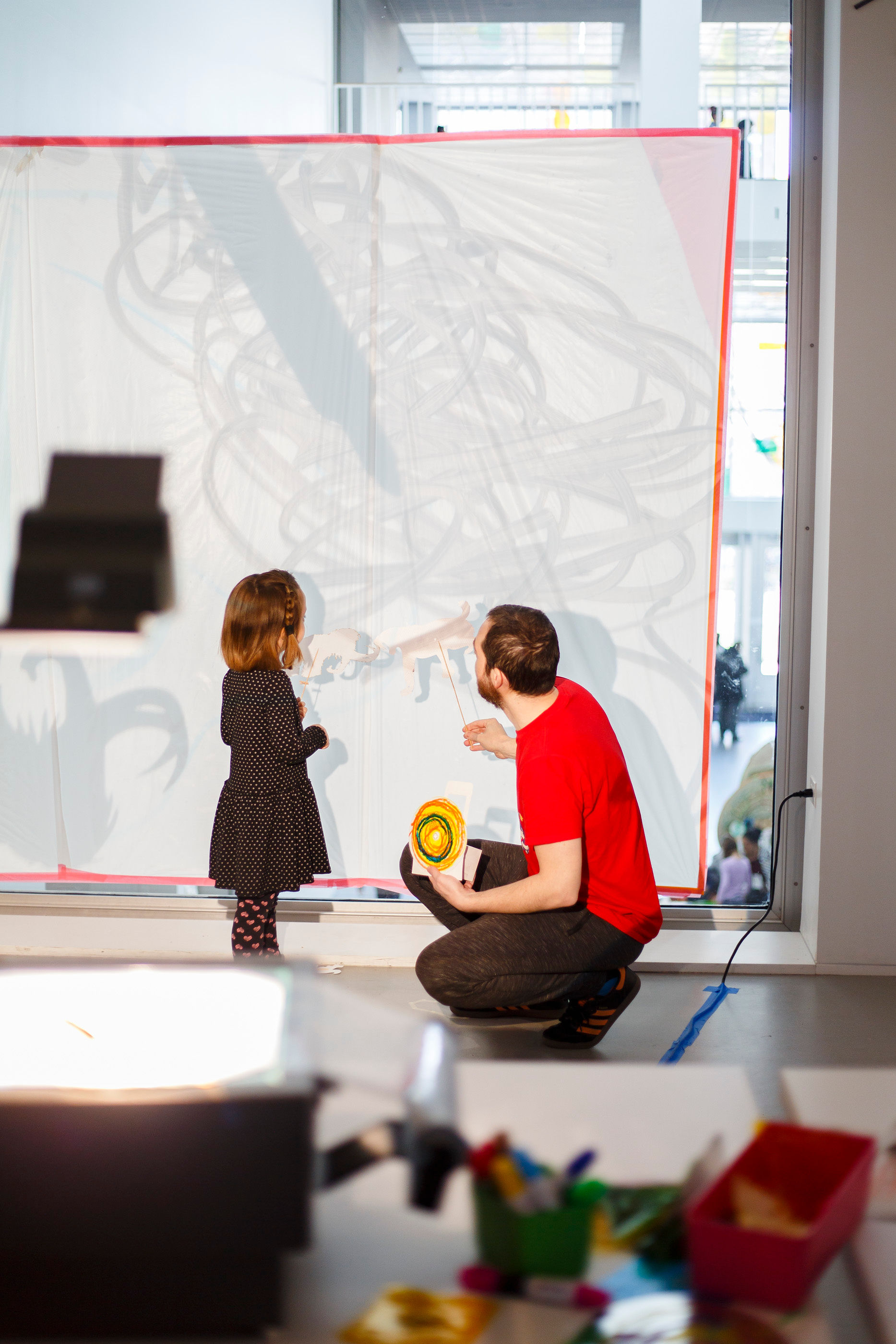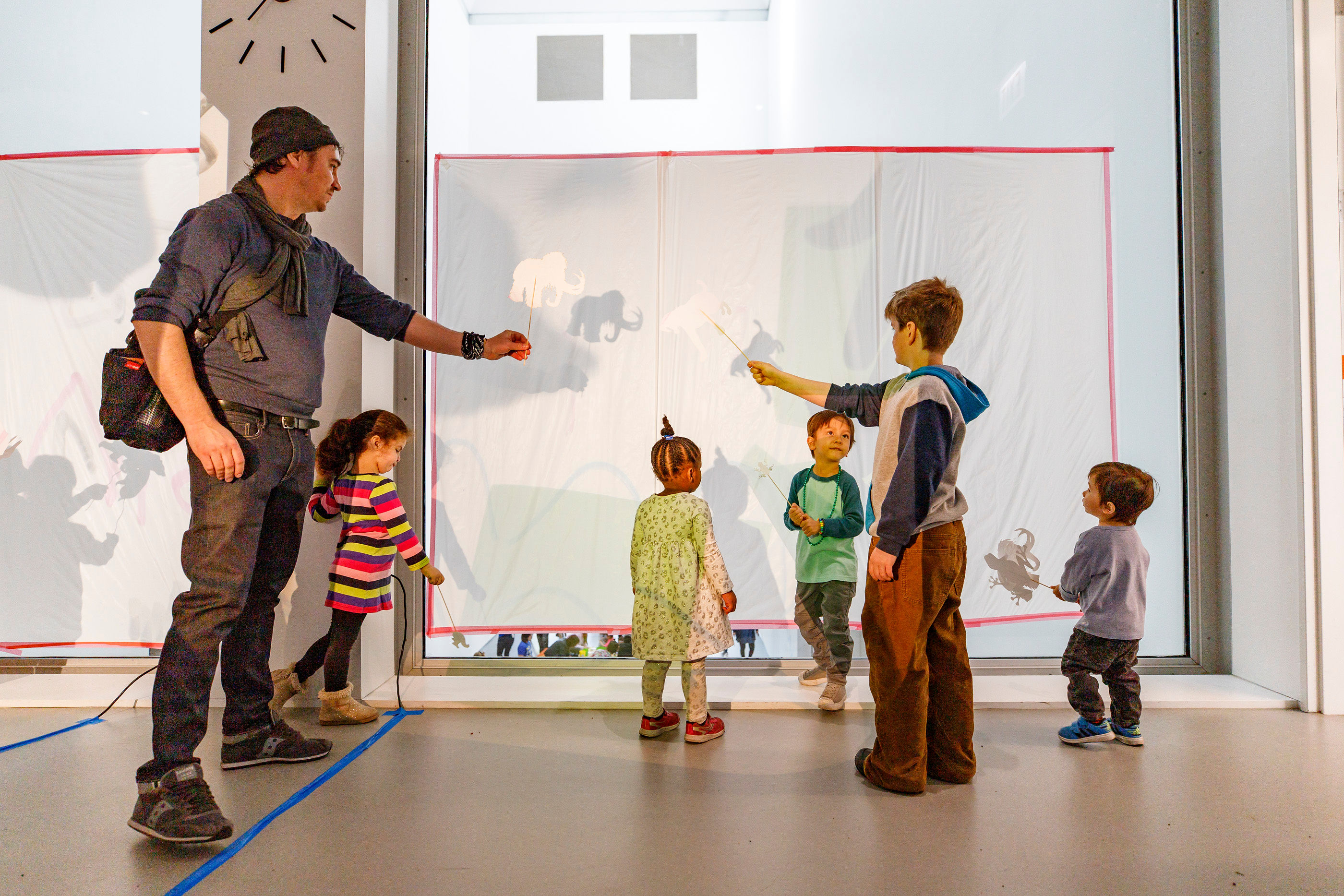 - Shadow puppets and scrolling backgrounds on overhead projectors. White plastic sheets were taped up on the 2nd floor windows facing the museum lobby, so everyone entering the museum would be able to see the shadows. I pre-made a bunch of shadow puppets of animals from the ice age and animals that hibernate in the winter. The puppets were cut at different sizes for kids to experiment with scale up against the screen versus on top of the overhead projector. I also installed acetate roller attachments on top of the overhead projectors, where kids could draw and project a scrolling background.