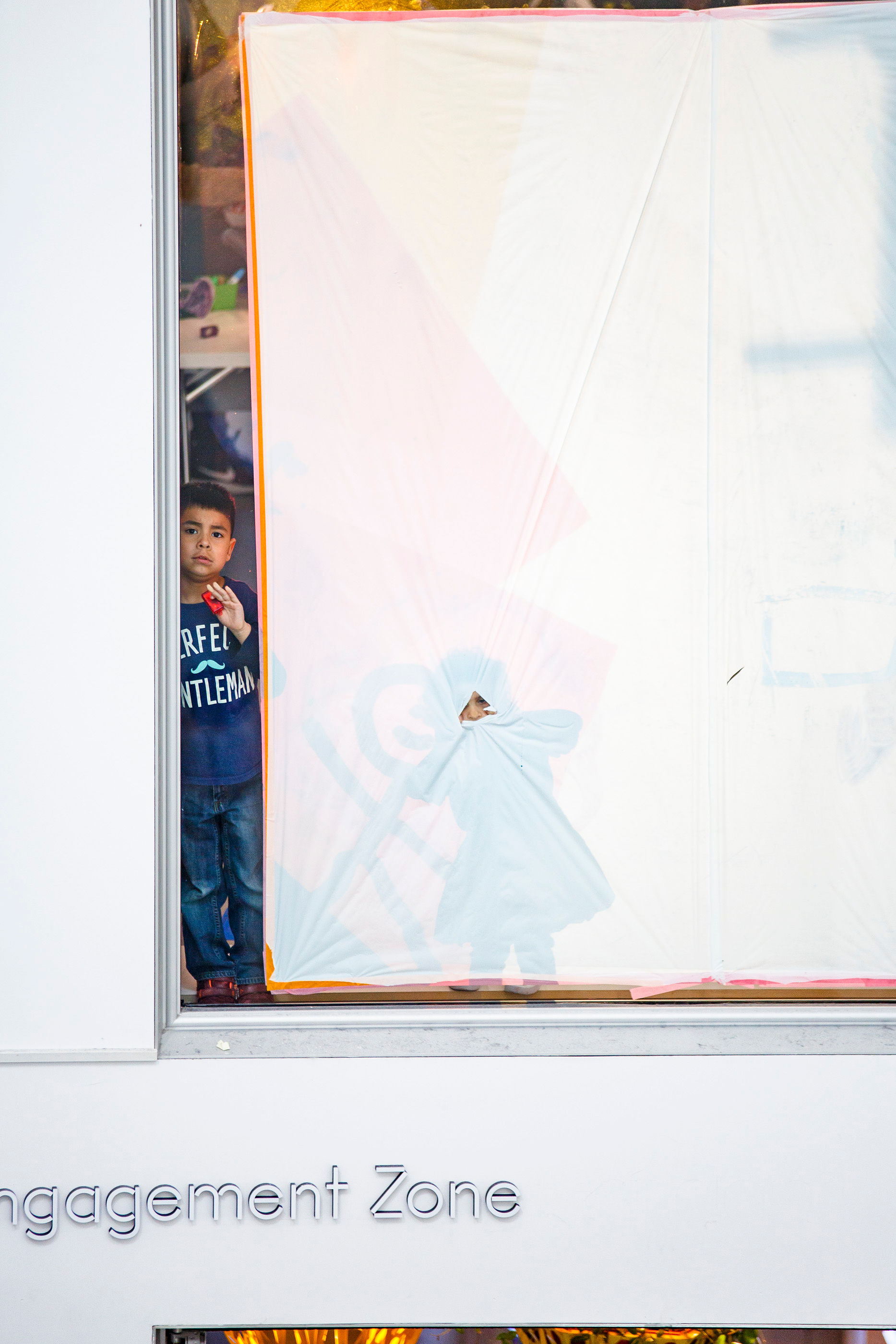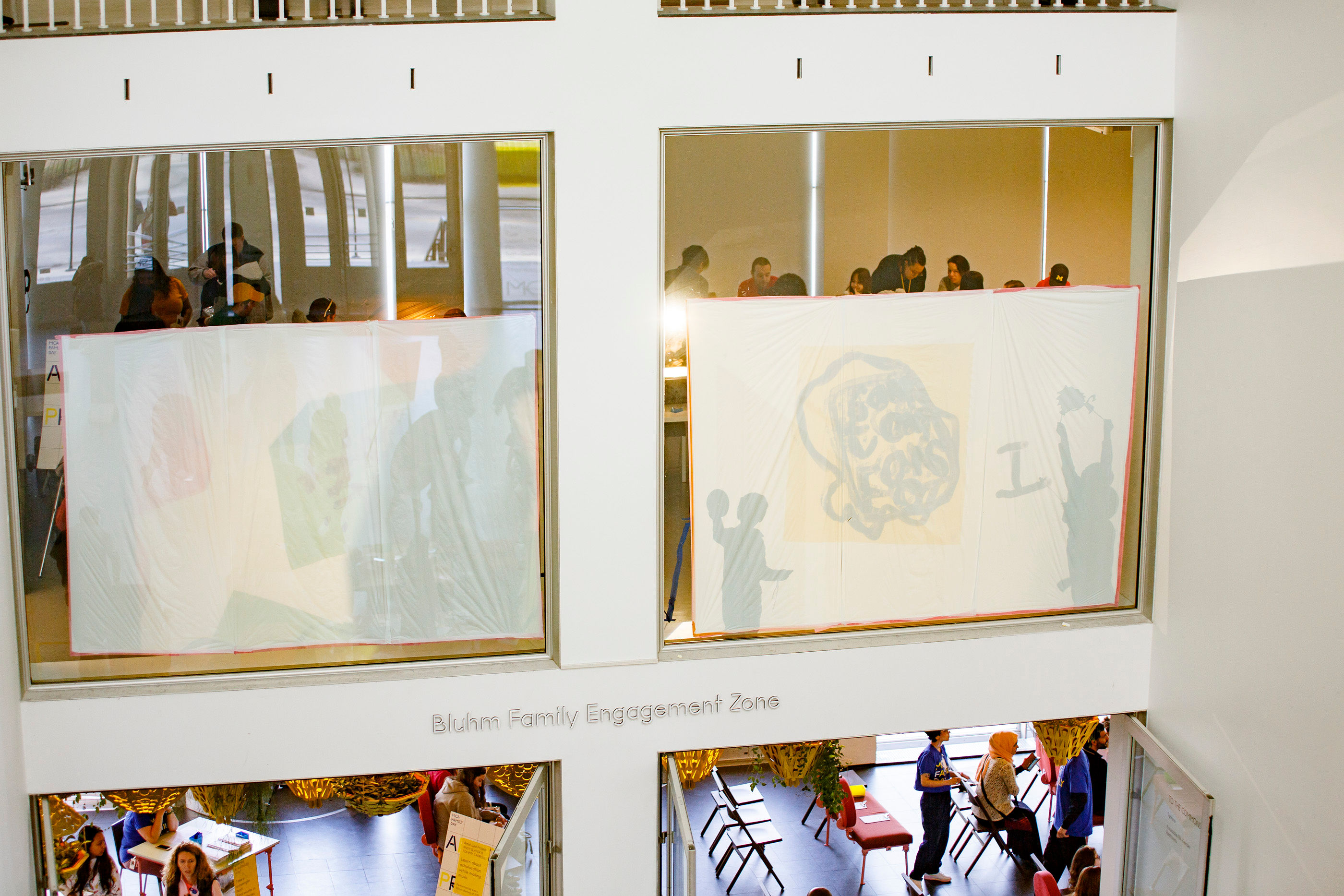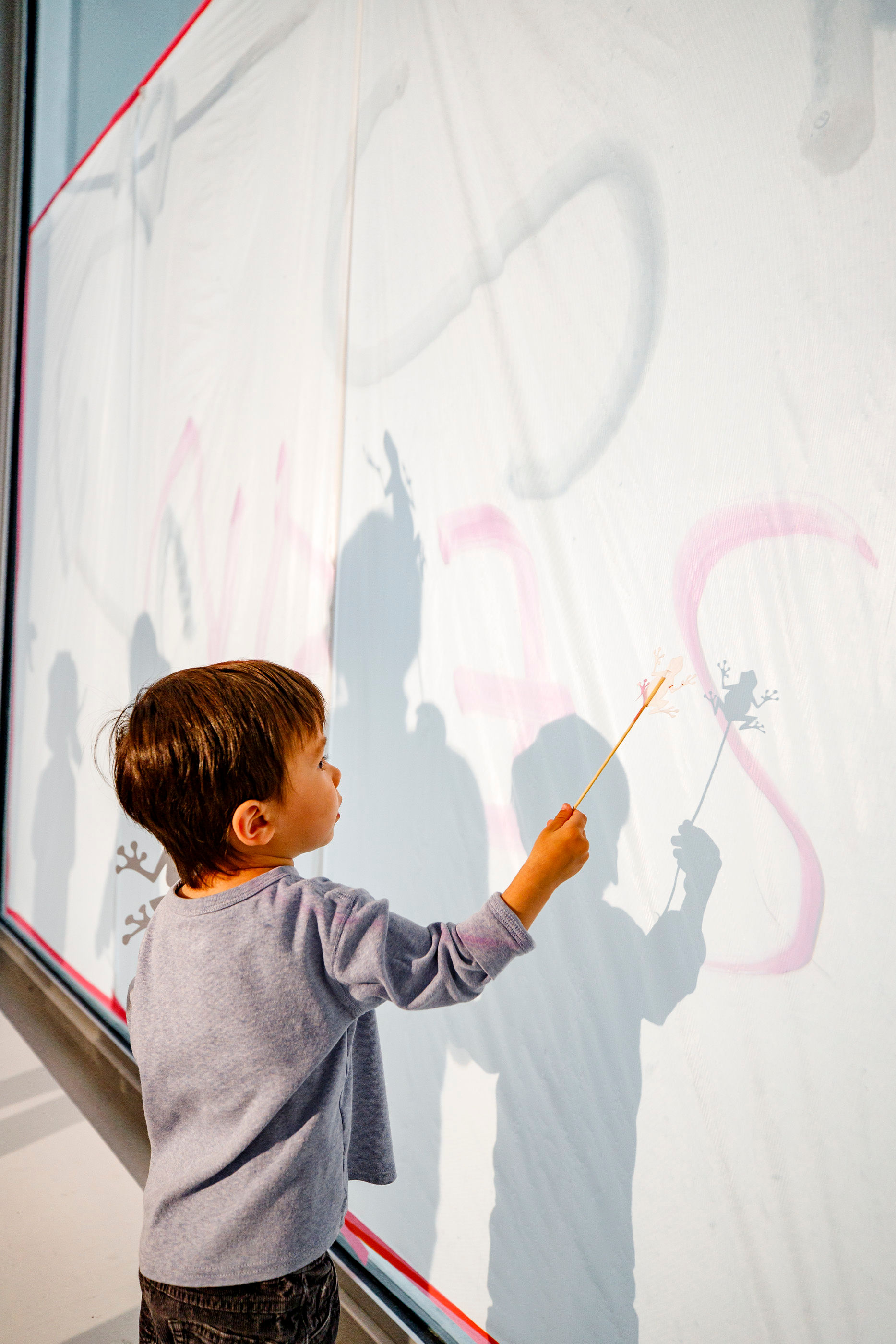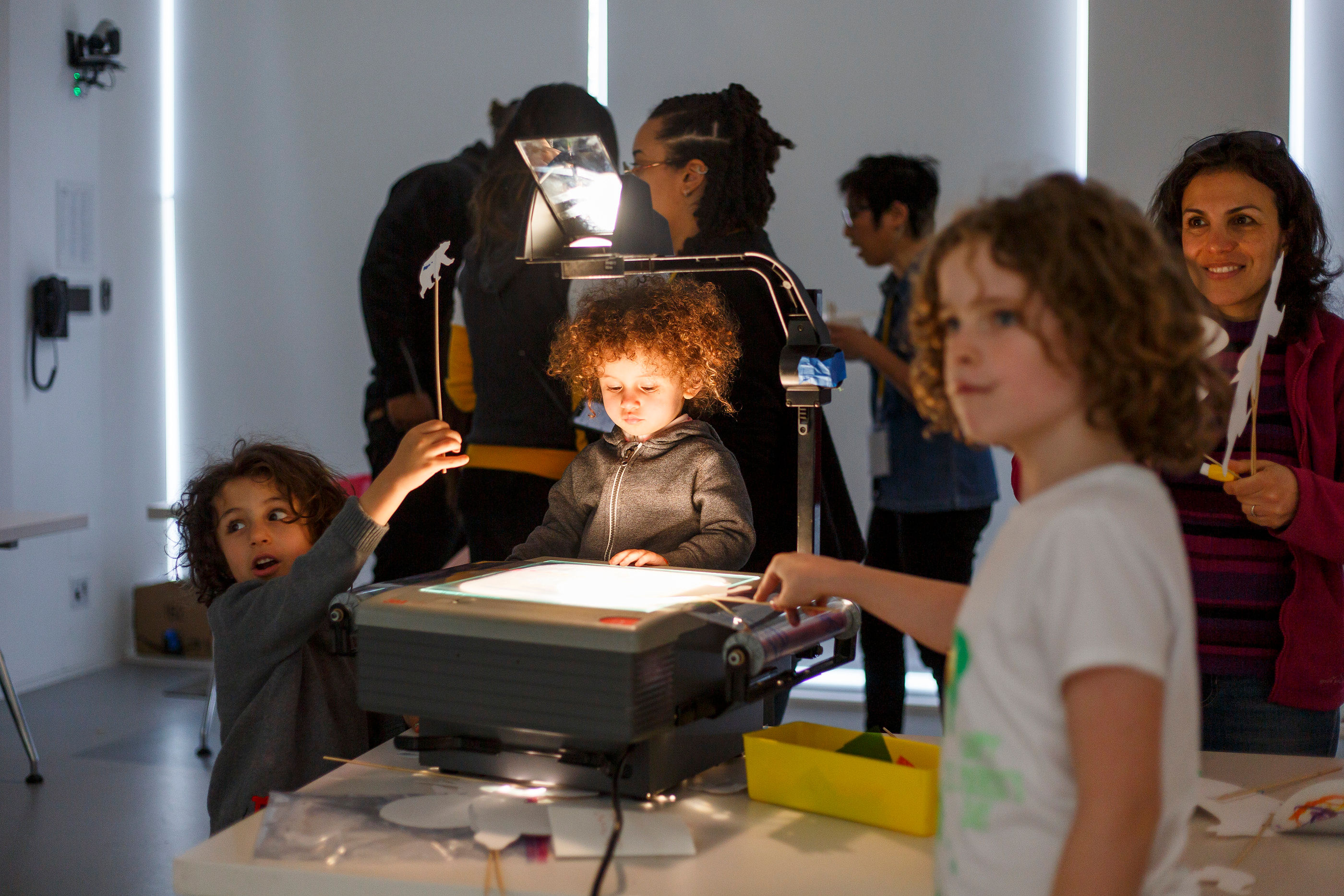 - Shadow puppets and scrolling backgrounds on overhead projectors. White plastic sheets were taped up on the 2nd floor windows facing the museum lobby, so everyone entering the museum would be able to see the shadows. I pre-made a bunch of shadow puppets of animals from the ice age and animals that hibernate in the winter. The puppets were cut at different sizes for kids to experiment with scale up against the screen versus on top of the overhead projector. I also installed acetate roller attachments on top of the overhead projectors, where kids could draw and project a scrolling background.