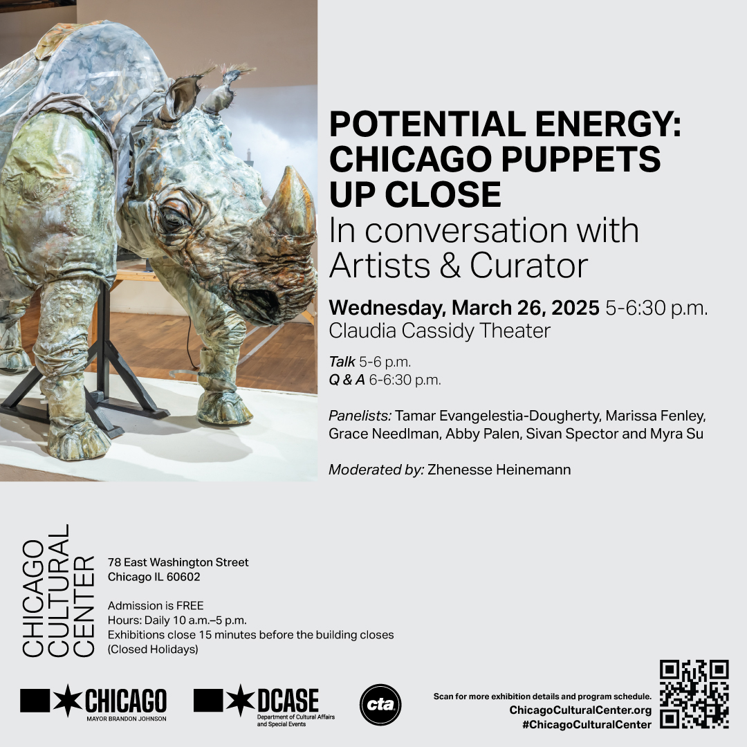 Holy cow (or should I say, rhino?), our superstar curatorial team managed to bring the POTENTIAL ENERGY puppet exhibit to a whole wing of the Chicago Cultural Center from December 21, 2024 to April 6, 2025! My GOODNIGHT SHADOW puppets and film are on display.