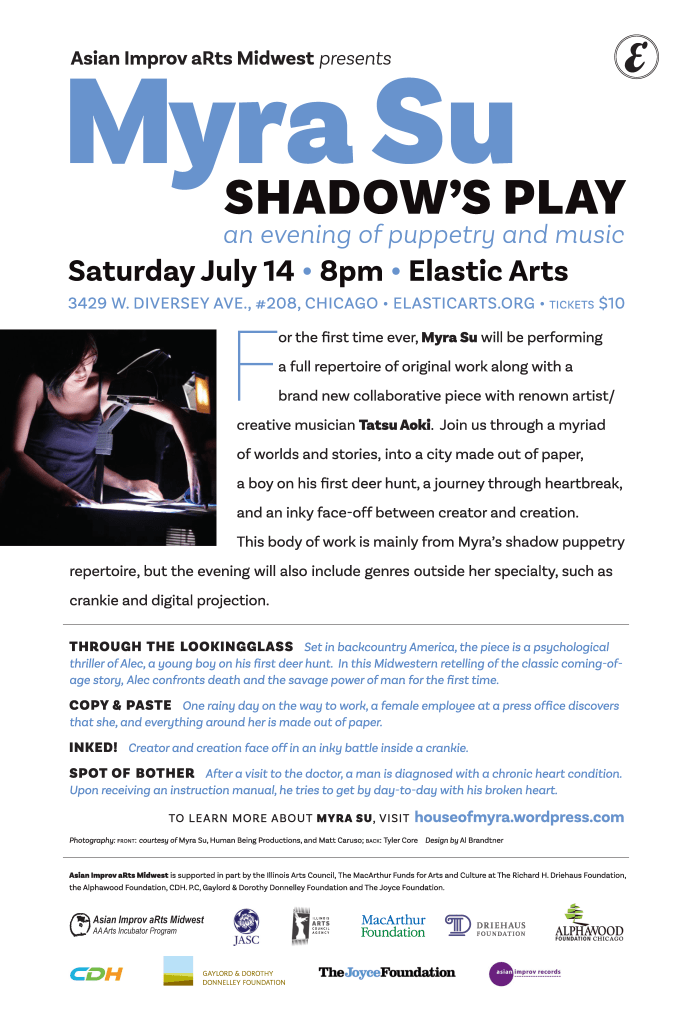 The wonderful Tatsu Aoki and Asian Improv aRts Midwest is helping me produce a show featuring the full repertoire of my work, including a preview of a new collaborative piece!