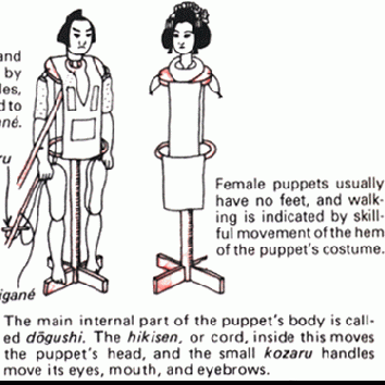 Male and female puppets also have different mechanical designs. Female puppets are literally designed without legs (and even arms), which is perhaps eerily reflective of the constrained life of female royalty at the time. To create the illusion of limbs, the puppeteers would masterfully gesture with the puppet’s kimono by clenching the sleeve in a certain way, etc. When walking, female puppets are able to naturally glide across the stage by the movement of her hem.