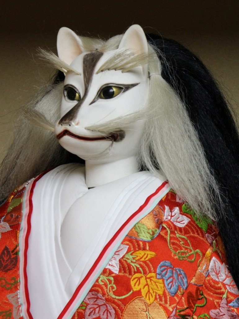 I have no idea how it was constructed, but the fox in human form had a special flippable head mechanism (called menketsu) that could switch back and forth between a fox and human face. Even the hair changes between white in her half-yokai form and black in her human form. I’ve never seen a puppet head switch like this so fast and smooth. It reminded me of bian lian performers who can almost instantaneously change their masks with a quick swipe of a fan or head turn.
